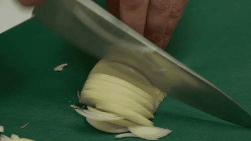 Нарезать лук тонкой соломкой. Добавить его в казан к мясу и жарить, помешивая, пока лук не станет прозрачным.