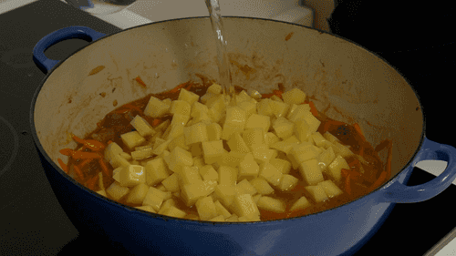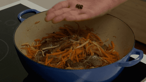 Добавить морковь и сельдерей в казан и жарить, помешивая, еще 3–5 минут.