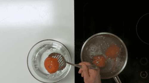 Помидоры избавить от кожуры. Для этого сделать на них крестообразные надрезы, положить в кипяток на 30 секунд, затем переложить в холодную воду. Снять кожуру и нарезать помидоры кубиком.