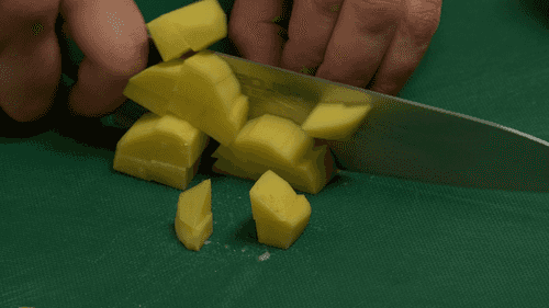 Нарезать картофель небольшим кубиком, бросить его в казан.