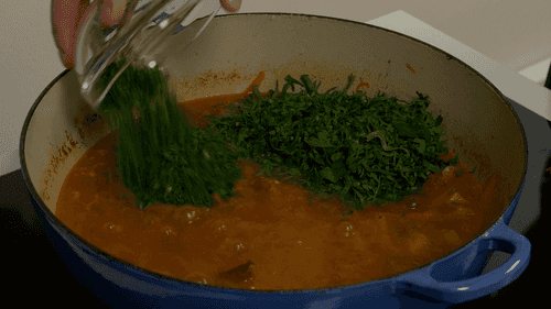 Нарубить зелень и добавить ее в готовый соус, туда же добавить пропущенный через пресс чеснок. Посолить и поперчить, если необходимо.