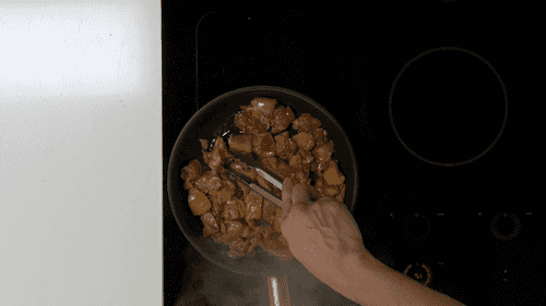 Выложить мясо на сковороду в один слой и вылить соус. Тушить 6 минут.