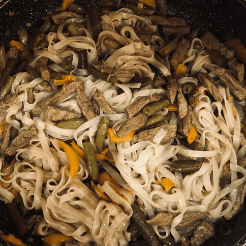 Слить воду из емкости, в которой находится рисовая лапша, добавить лапшу на сковороду ко всем ингредиентам, залить кипятком и варить 5 минут.