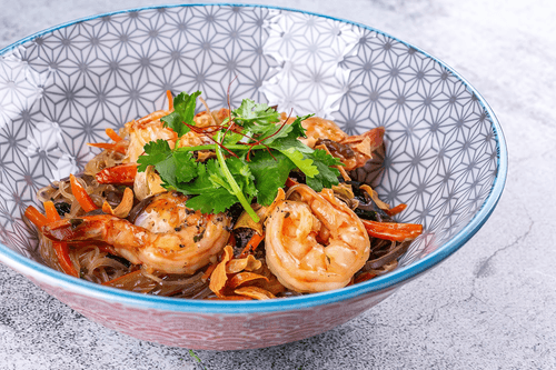 Переложить креветки с лапшой на тарелку, перед подачей посыпать кунжутом, украсить кинзой и нитями перца габан.