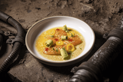 Севиче из лосося, приправленное ароматным соусом шисо и освежающим кумкватом, представлено шеф-поваром бара «Котельная» Дмитрием Погореловым. Это блюдо сочетает в себе яркие и насыщенные вкусы, которые прекрасно подчеркивают свежесть рыбы, а необычная комбинация ингредиентов придает ему уникальность. Севиче идеально подходит для легкого и изысканного ужина, а также станет ярким акцентом на праздничном столе.