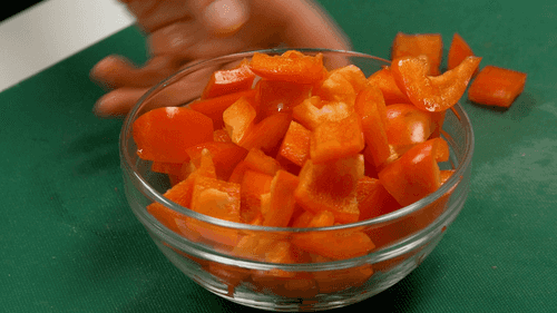 Пока картофель тушится, нарезать остальные овощи. Перец избавить от семян и нарезать крупными квадратными кусочками.