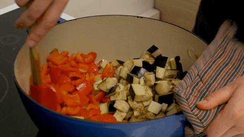 Добавить перец и баклажан к картофелю, накрыть крышкой и тушить еще 7–10 минут.