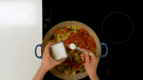 Влить пассату, добавить сахар, перемешать и тушить, не накрывая крышкой, еще несколько минут.
