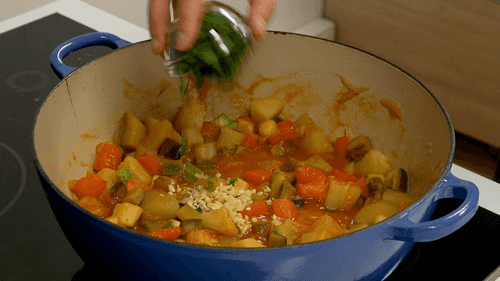 Измельчить чеснок и зелень, добавить их к овощам, поперчить и посолить еще, если нужно. Снять овощи с огня и дать им постоять минут 5, прежде чем подавать.