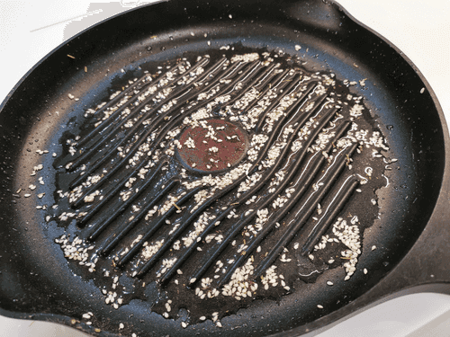 Влить растительное масло в сковороду, добавить кунжут и поставить на сильный огонь.