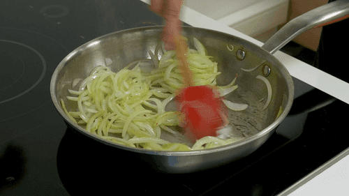 Бросить в сковороду лук и жарить его на небольшом огне до золотистого цвета, постоянно помешивая.