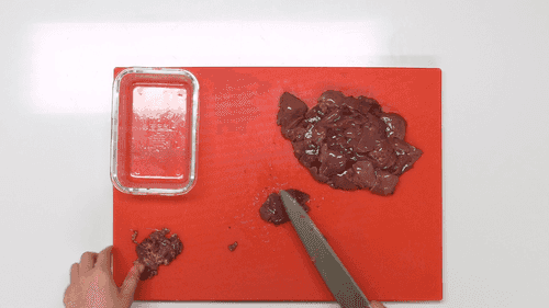 Пока жарится лук, зачистить печень от жилок и пленок.