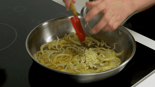Добавить к луку чеснок и жарить 30 секунд, до появления яркого аромата.