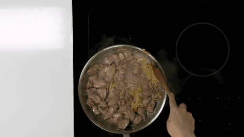 Выложить в сковороду печень, увеличить огонь и жарить 5–7 минут, не забывая помешивать.