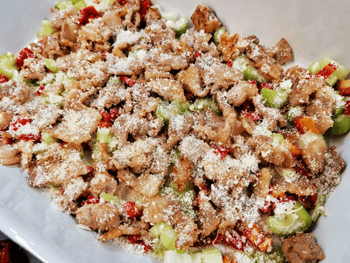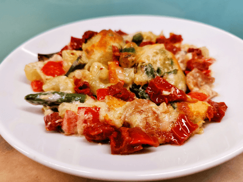 Достать блюдо, как только оно хорошо подрумянится, и перемешать с вялеными томатами.
