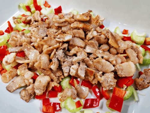 Нарезать перец рамиро и отправить его к сельдерею.