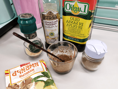Смешать ингредиенты для маринада: оливковое масло, бальзамический уксус, черный перец, имбирь, чеснок.