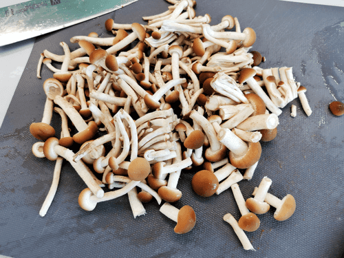 Опята промыть, подсушить и разделить между собой. Длинные грибы нарезать пополам.