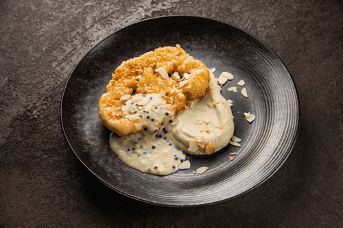 Цветная капуста с кремом из миндаля — это изысканное блюдо авторской кухни, которое сочетает в себе нежность овощей и богатый ореховый вкус. Блюдо вдохновлено гастрономическими традициями, соединяющими хрустящие текстуры с кремовыми соусами. Цветная капуста, покрытая воздушным кляром и обжаренная до золотистой корочки, становится идеальной основой для гармоничного дуэта: утонченного миндального пюре с медовой ноткой и нежного соуса бешамель на растительной основе. Вкус этого блюда — баланс мягкой сладости, ореховой глубины и легкой пикантности соуса «Сладкий чили». Украшенное лепестками миндаля, оно приобретает дополнительный изысканный акцент. Блюдо подходит как для торжественного ужина, так и для изысканного повседневного питания, радуя гурманов своей текстурой и утонченностью.