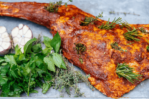 Лопатка ягненка с паприкой — это изысканное блюдо европейской кухни, воплощающее гармонию нежного мяса и ароматных специй. Исторически ягненок часто использовался в традиционных средиземноморских и французских рецептах благодаря его мягкому вкусу и способности отлично впитывать пряности. В этом варианте мясо пропитывается пикантной намазкой, в состав которой входит копченая паприка, чеснок и луковый порошок, создавая насыщенный и глубокий вкус с легкой сладковатой ноткой. Веточки свежего розмарина и тимьяна добавляют блюду изысканную хвойную свежесть. Запеченная в двойной фольге лопатка приобретает сочность и мягкость, а финальная сервировка с базиликом и кинзой подчеркивает её аромат. Блюдо идеально сочетается с запеченными овощами и бокалом терпкого красного вина, создавая кулинарное удовольствие, достойное гурманов.