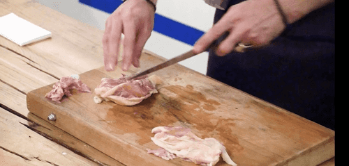 Снять кожу с бедер. Замариновать мясо в смеси из 100 мл оливкового масла, специй и белого вина. Отправить в холодильник на пару часов.