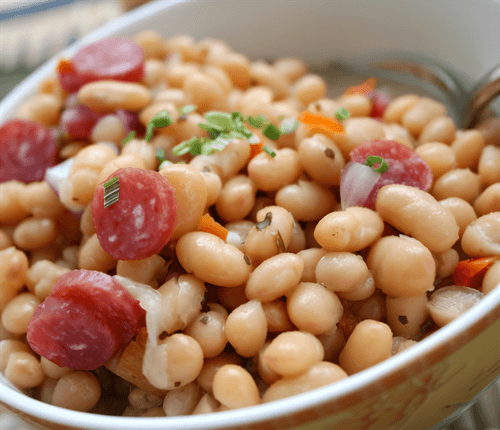 Белая фасоль с колбасой и беконом