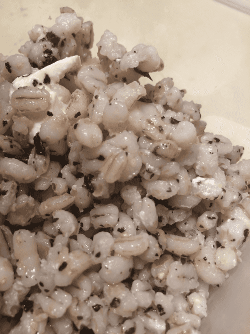 Мелко нарубленные листья петрушки и крупно нарезанные листья базилика смешать с сыром, оливковым маслом и добавить в перловку. Перемешать и сразу снять с огня.
