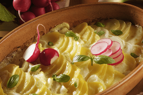 Важный картофель — это изысканное блюдо русской кухни, сочетающее нежность обжаренных ломтиков картофеля и богатый аромат шафрана и чеснока. Его происхождение можно связать с традиционными деревенскими рецептами, где простые ингредиенты превращаются в настоящие кулинарные шедевры. Хрустящая золотистая корочка, насыщенный вкус лука и петрушки, пропитанные нежным соусом, делают этот картофель особенным. Техника приготовления — двойная обжарка и последующее тушение в духовке — придаёт блюду удивительную текстуру: снаружи хрустящее, внутри мягкое и насыщенное ароматами. Оно идеально сочетается с мясными и рыбными блюдами, но может быть самостоятельным угощением, поданным прямо в керамическом горшке. Подача в таком виде сохраняет тепло и подчёркивает уютную атмосферу домашней трапезы.