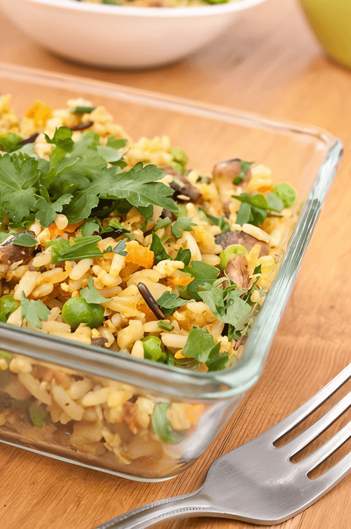 Гарнир смешать с готовым рисом, помешивая веселкой. Сверху посыпать тертым сыром. Рис можно окрасить шафраном.
