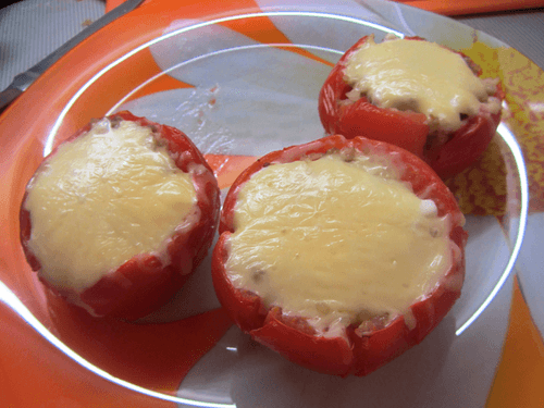 Наполненные фаршем помидоры положить на сковороду, смазанную маслом; можно посыпать их натертым сыром. Затем сбрызнуть маслом и запечь в духовом шкафу (15–20 минут).