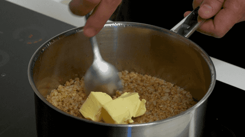 В готовую гречневую крупу добавить сливочное масло, перемешать и дать ей остыть.