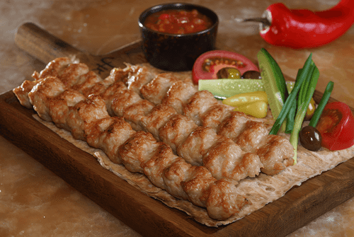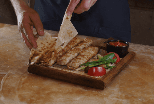 Подавать сразу же, с лавашом, оливками, зеленым луком и домашней аджикой. При подаче накрыть кебаб листом лаваша, чтобы он не остывал.