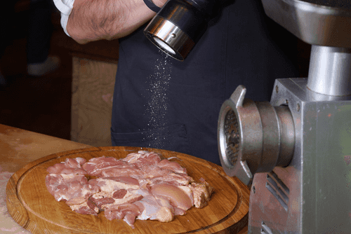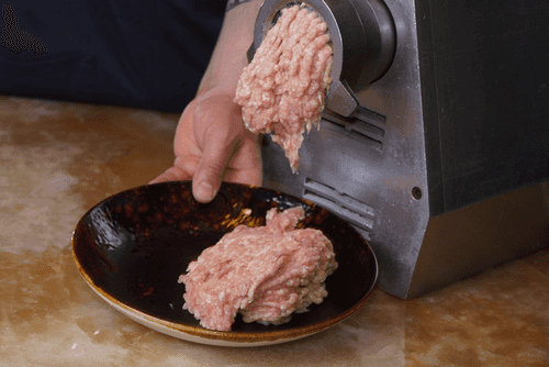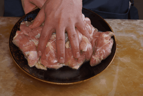 Куриное филе (и грудки, и бедра) заранее заморозить. Затем переложить из морозилки на полку холодильника и дождаться, пока оно растает. Выделившуюся жидкость слить. Вырезать из филе самые грубые фрагменты соединительной ткани — например, между бедром и голенью.