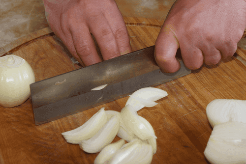 Жир и лук произвольно нарезать небольшими кусочками.