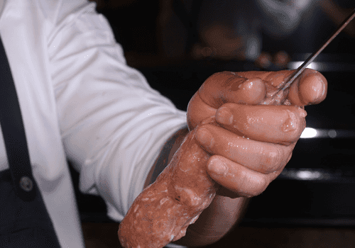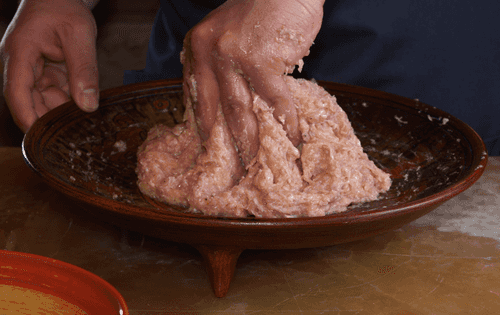 Замешивать фарш, собирая его ребром ладони от краев к середине, минуты 2–3. Проверить, стал ли фарш эластичным: для это собрать его с краев и, взяв в горсть, потянуть вверх, фарш должен слегка тянуться, а не сразу падать обратно в миску. Тут лучше недомешать, чем перемесить: если фарш нагреется, то жир начнет плавится, и сочного кебаба не получится. Готовый фарш убрать в холодильник на 3–4 часа.