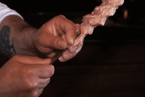 Влажными руками сформировать кебабы: на каждый шампур пойдет примерно 100 грамм фарша. Сначала скатать из фарша шарик, надеть на шампур, а затем, взяв шампур в ладонь, распределить фарш, делая пальцами глубокие бороздки на равном расстоянии друг от друга.