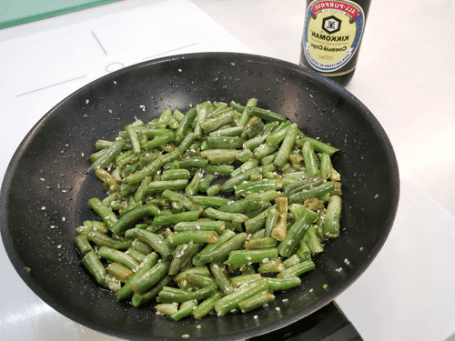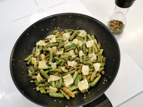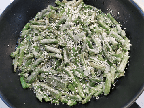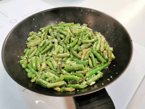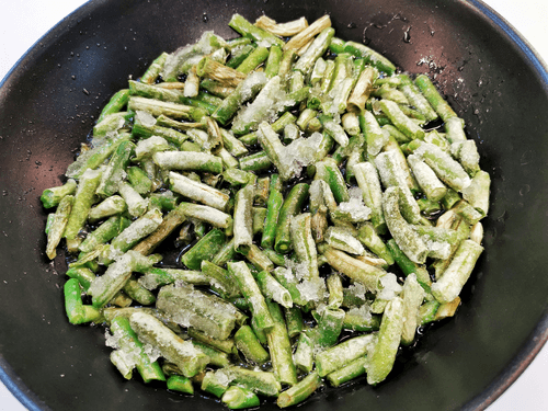 Всыпать на раскаленную сковороду с маслом стручковую фасоль.