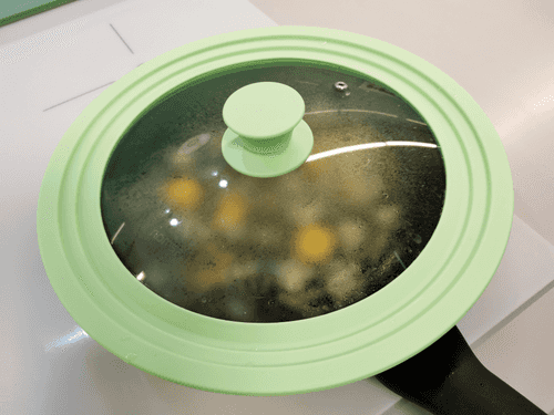 Закрыть крышкой и убавить огонь до минимума. Готовить еще 1–2 минуты, пока яйца полностью не схватятся.
