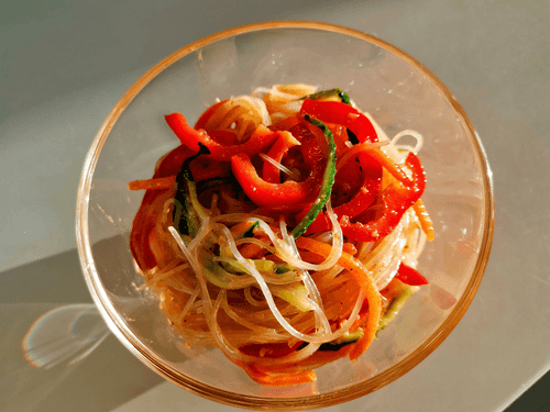 Фунчоза с овощами и морковью по-корейски — яркое, легкое и ароматное блюдо корейской кухни. Его корни уходят в традицию сочетания хрустящих овощей и нежной стеклянной лапши, создавая гармонию текстур и вкусов. Основа блюда — фунчоза, прозрачная и упругая лапша, которая отлично впитывает пикантные соусы. Свежие огурцы и сладкий перец рамиро добавляют хрусткость, а морковь по-корейски вносит пикантные нотки и легкую остроту. Заправка объединяет все ингредиенты в единую симфонию вкусов, делая блюдо освежающим и насыщенным. Фунчоза с овощами идеально подходит как легкий обед или ужин, а также как гарнир к мясным и рыбным блюдам. Это блюдо часто готовят на праздники или дружеские встречи, радуя гостей его ярким видом и богатым вкусом.
