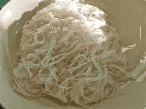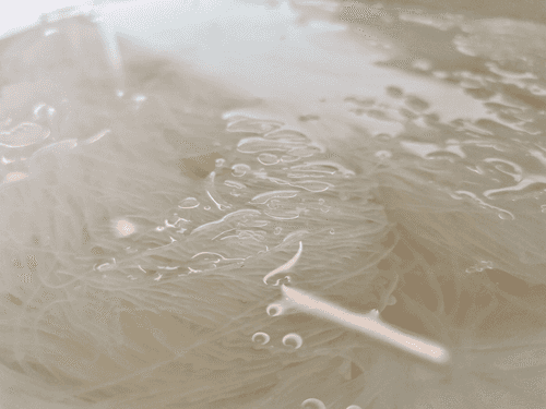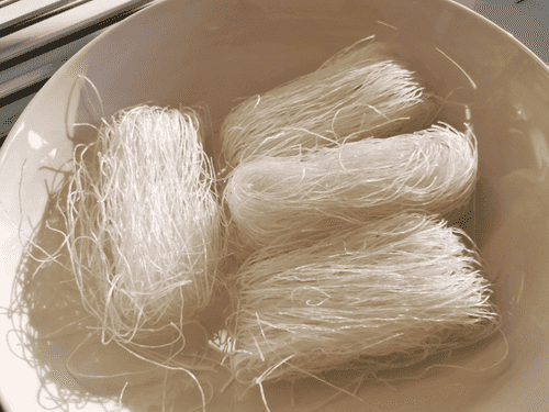 Залить фунчозу горячей водой и оставить на 5 минут.