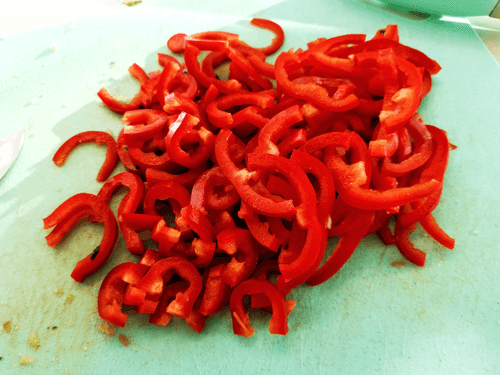Нарезать перец полукольцами.
