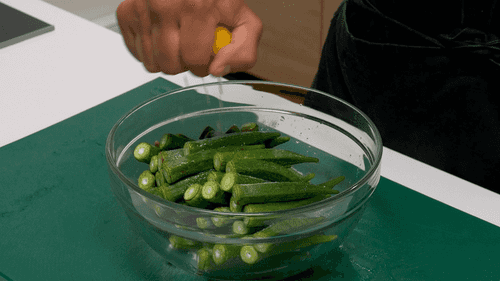 Посыпать бамию солью, выдавить лимонный сок, перемешать и оставить на 20–30 минут.