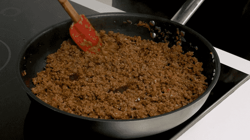 Добавить фарш, соль, перец, паприку и чили. Жарить, помешивая, пока фарш не потемнеет.