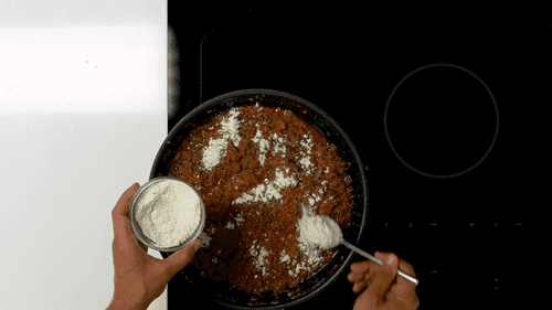 Добавить к мясу муку, перемешать и жарить еще 2 минуты.