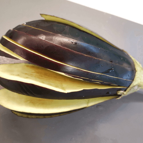 Баклажан нарезать слайсами толщиной около 1 см, но не до конца.