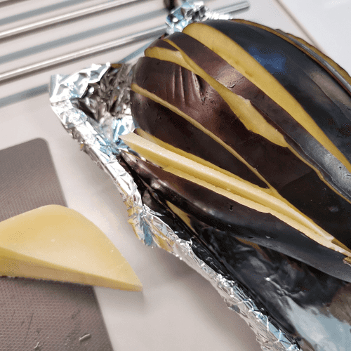 В первое отверстие вложить пару слайсов пармезана.