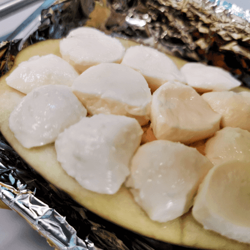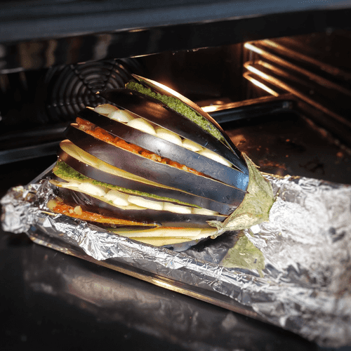 Смазать кожицу баклажана оливковым маслом и отправить в разогретую до 190 градусов духовку на 35 минут.