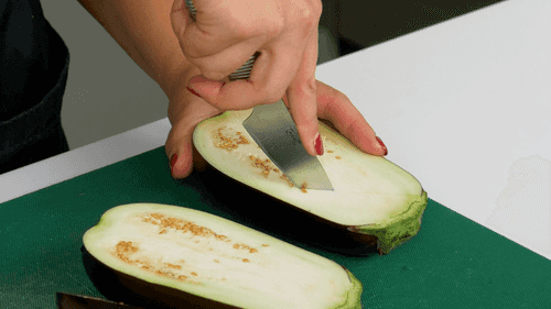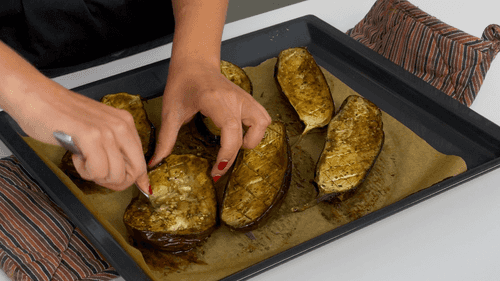 Баклажаны разрезать пополам вдоль и сделать на мякоти глубокие крестообразные надрезы, стараясь не повредить кожуру.