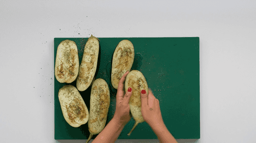 Смазать баклажаны маслом, посыпать солью, перцем и орегано. Выложить на противень разрезом вниз и отправить в духовку, разогретую до 200 градусов, на 30–40 минут.