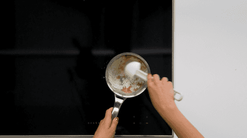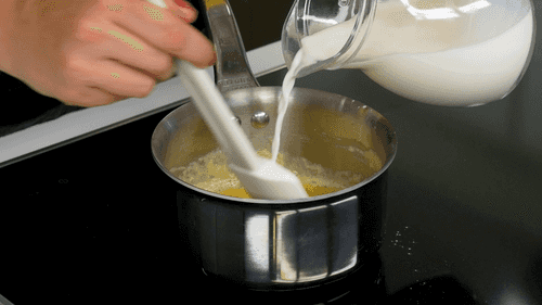 В сотейнике растопить сливочное масло, добавить муку и жарить, помешивая, 1–2 минуты до появления орехового аромата.